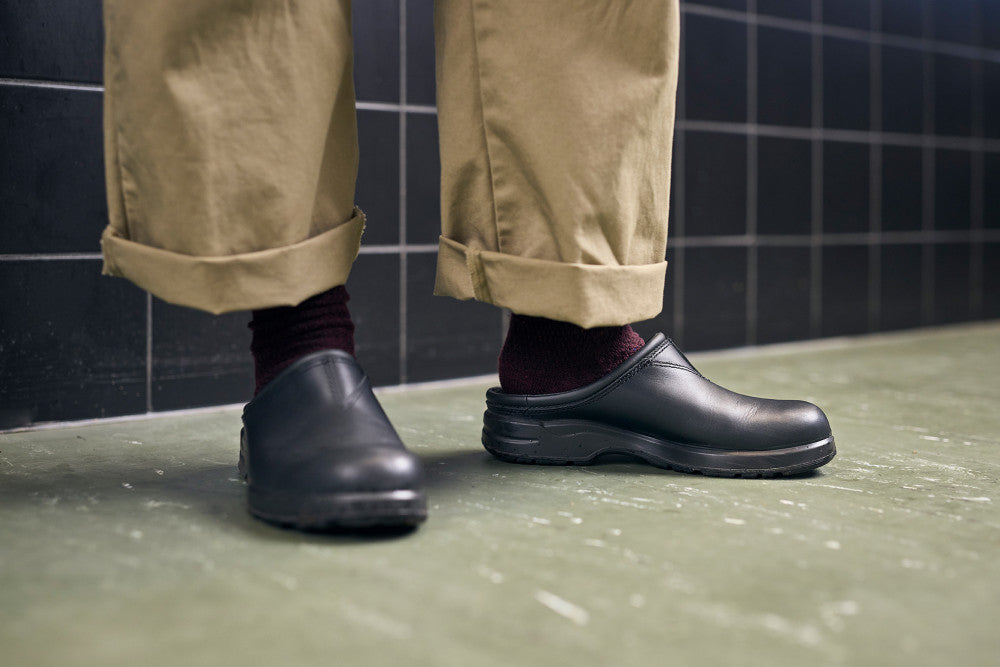 The #2381 Service Clog features slip-on ease with a grippy VibramĀ® sole. and durable water-resistant leather upper. which makes this clog ideal for demanding environments like kitchens. medical environments and the service industry.
